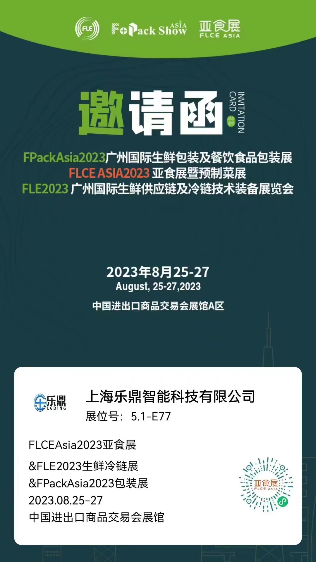 沐鷹智能上海公司(上海樂鼎智能科技有限公司)于8.25-8.27日在廣州廣交會(huì)展參加2023FLCEAsia亞食展暨預(yù)制菜展,展位號(hào):5.1-E77, 歡迎新老客戶過來現(xiàn)場參觀和指導(dǎo)!